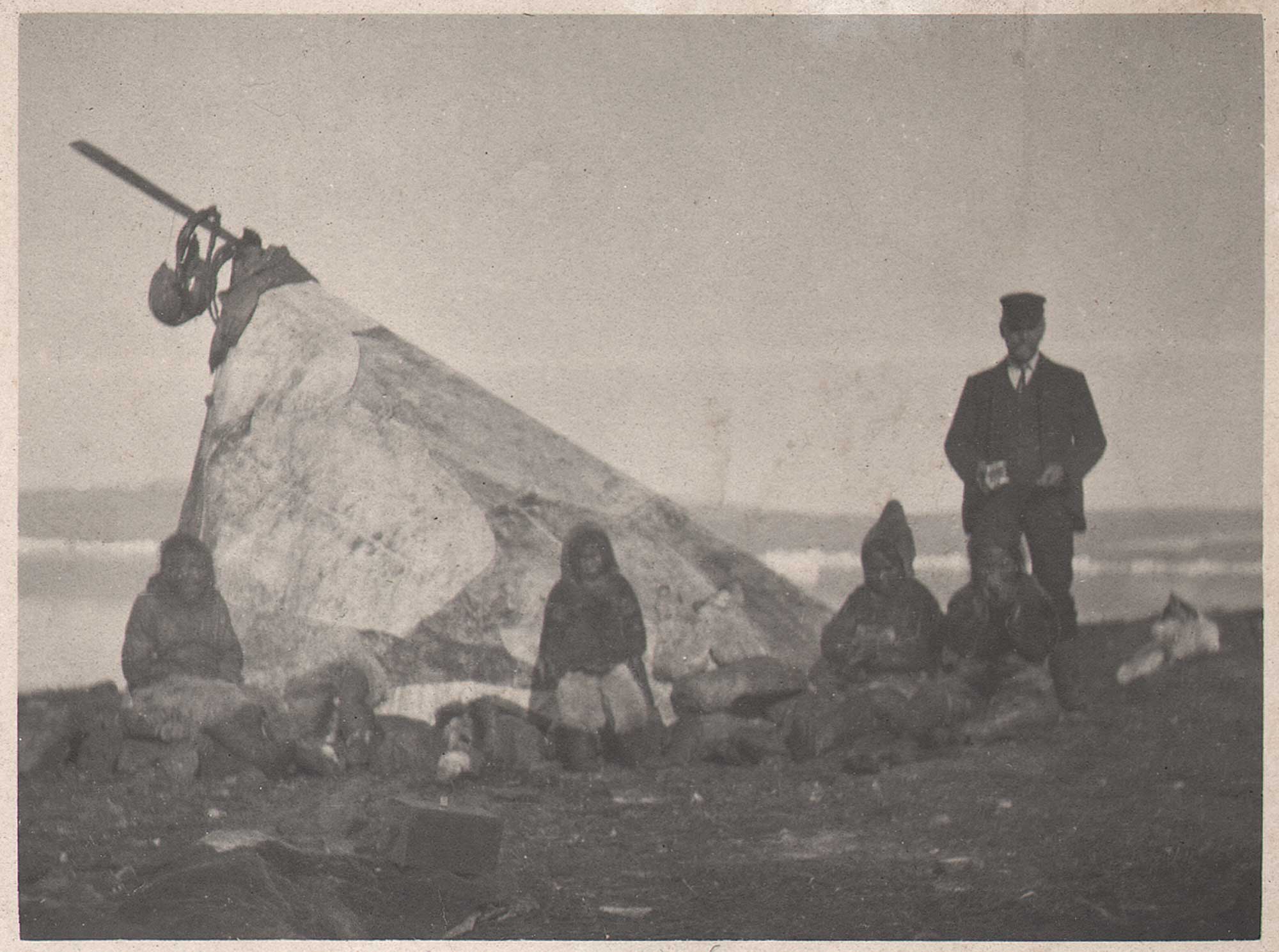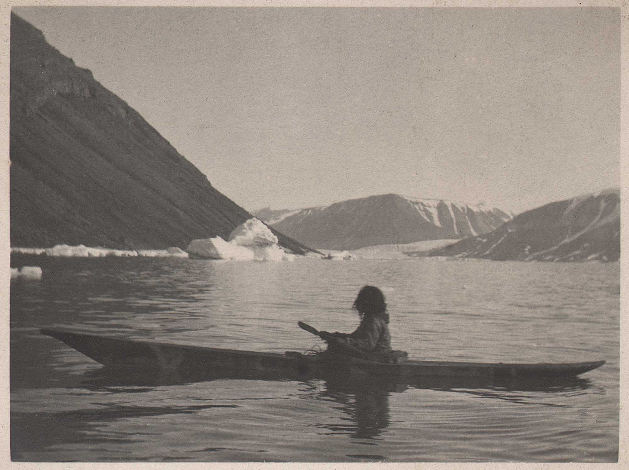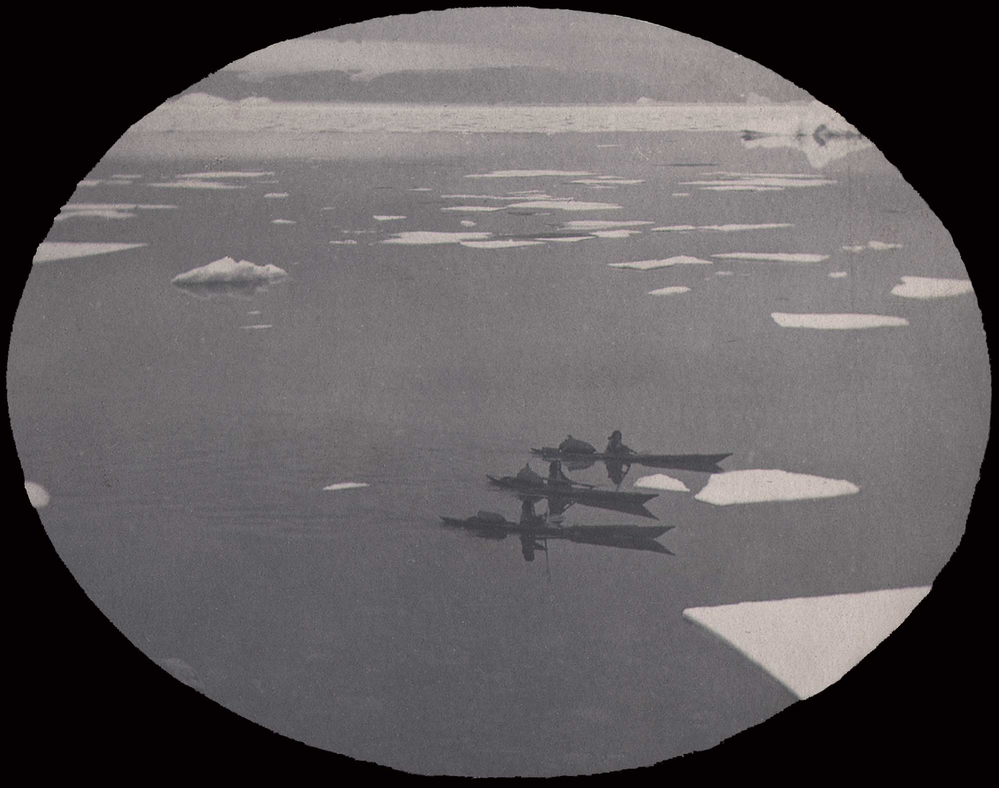 “Kayaks off Ooistona (?)”, 1901, printed (c. 1901-05) Attributed: Limond Corbin Stone, (1873-1951) American, bromide or platinum print, 7.3 x 9.3 cm. A hunting party of three Inuit navigate ice flows in their traditional qajaq (kayak) boats. The vessels are made from bent driftwood or whalebone; assembled with wood pegs and leather ties and covered with stitched sealskin that has been oiled using animal fat like seal or whale to make it waterproof. On the back of each kayak are sealskin floats known as avataq. From Weber Arctic we learn: “Inuk hunters filled seal skins with air and sewed them closed as a sort of ‘buoy’. These seal skin floats were then attached to spears so that when hit, the animal couldn’t dive back down to the ocean floor. Instead, they were held up by the float, allowing the hunter to retrieve it.” From: PhotoSeed Archive