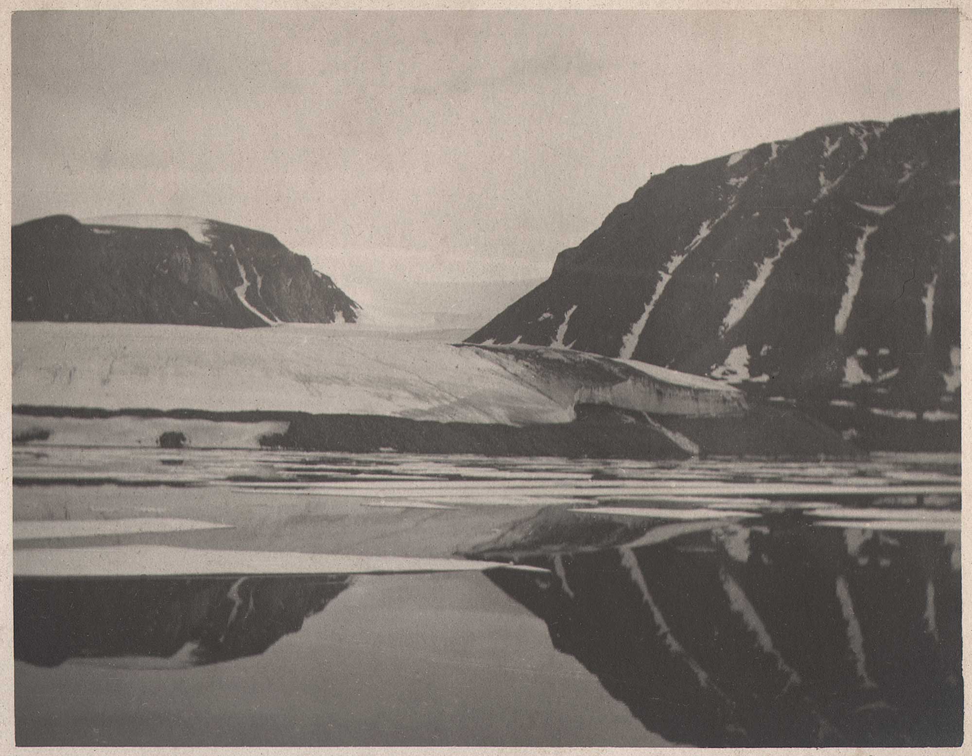 “Glacier and Moraines -Smith Sound”, 1901, printed (c. 1901-05) Attributed: Limond Corbin Stone, (1873-1951) American, bromide print, 8.8 x 11.3 | 10.2 x 15.0 cm. A pleasing reflection in the waters of Smith Sound, “an Arctic sea passage between Greenland and Nunavut’s northernmost island, Ellesmere Island. It links Baffin Bay with Kane Basin and forms part of the Nares Strait. On the Canadian side it extends from Cape Sabine in the north to Cape Isabella in the south. On the Greenland side of the sound were the now abandoned settlements of Etah and Annoatok.” From: PhotoSeed Archive