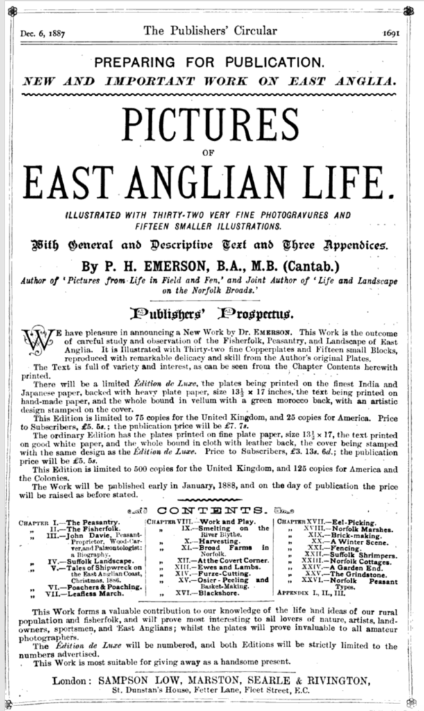 In addition to descriptions for Emersons works Life and Landscape on the Norfolk Broads, Pictures from Life in Field and Farm, (sic-Fen) Idyls of the Norfolk Broads and Naturalistic Photography for students of the art, details for this 1888 folio were printed, along with some contemporary press reviews: