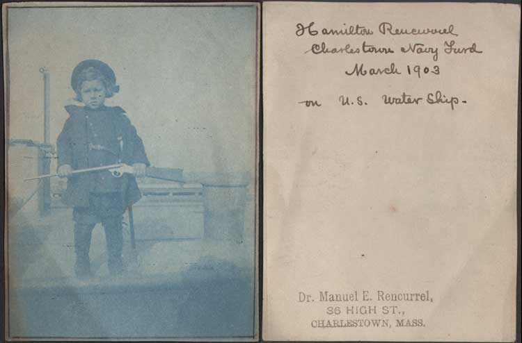“Hamilton Rencurrel | Charlestown Navy Yard | March 1903 | on U.S. Water Ship.” Cyanotype, 10.2 x 7.5 | 10.4 x 7.8 cm by Dr. Manuel E. Rencurrel, 36 High St., Charlestown, MASS. From: PhotoSeed Archive