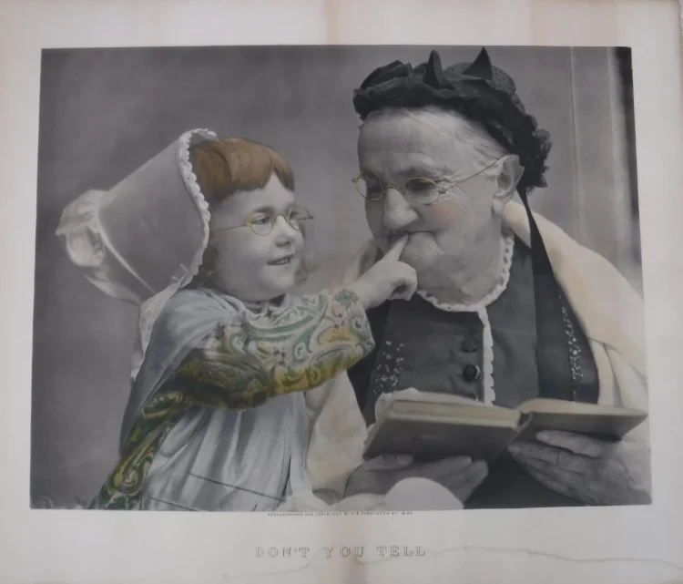 Parkinson is believed to have used these same two models— the young girl and older woman—in other photographs highlighting their age differences. Don’t You Tell is one example, also taken and copyrighted in 1890. The example below was found for sale on the web in early 2026, and has been selectively hand-colored.